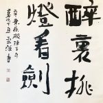 The phrase “醉裏挑燈看劍” — Drunken Hero Gazing at the Sword — comes from an ancient poem by Yue Fei, a Song dynasty general celebrated for his loyalty and courage. The calligraphy captures the spirit of reflection, bravery, and resilience — even in solitude, the warrior’s heart burns bright.