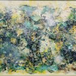 Foggy Landscape is a meditation on texture, decay, and renewal. Through layered pigments of green, ochre, and muted cream, H.A. Lim constructs a dense, tactile landscape that feels alive with motion and quiet energy. The work balances chaos and stillness — a sensory terrain that evokes both the microcosmic (cells, moss, corrosion) and the cosmic (nebulae, planetary formations).