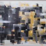 “Space–Time Continuum” is a bold and modern artwork that pulls you in the moment you look at it. Made with strong strokes of black, gold, grey, and white, the painting feels like different moments in life coming together — just like how time and space overlap.