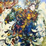 The dancer’s face, calm and poised, contrasts with the wild storm of colours that surround her. Each stroke seems to move — blues, reds, yellows, and whites collide and blend, like the rhythm of a drum or the sweep of a silk sleeve mid-performance.
